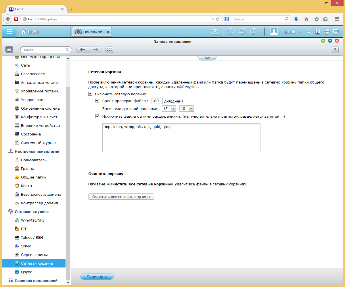 С протоколами SMB, AFP и WebDAV можно использовать корзину для удаляемых по сети файлов. В ее настройках предусмотрено указание максимального времени хранения и исключение определенных типов файлов.