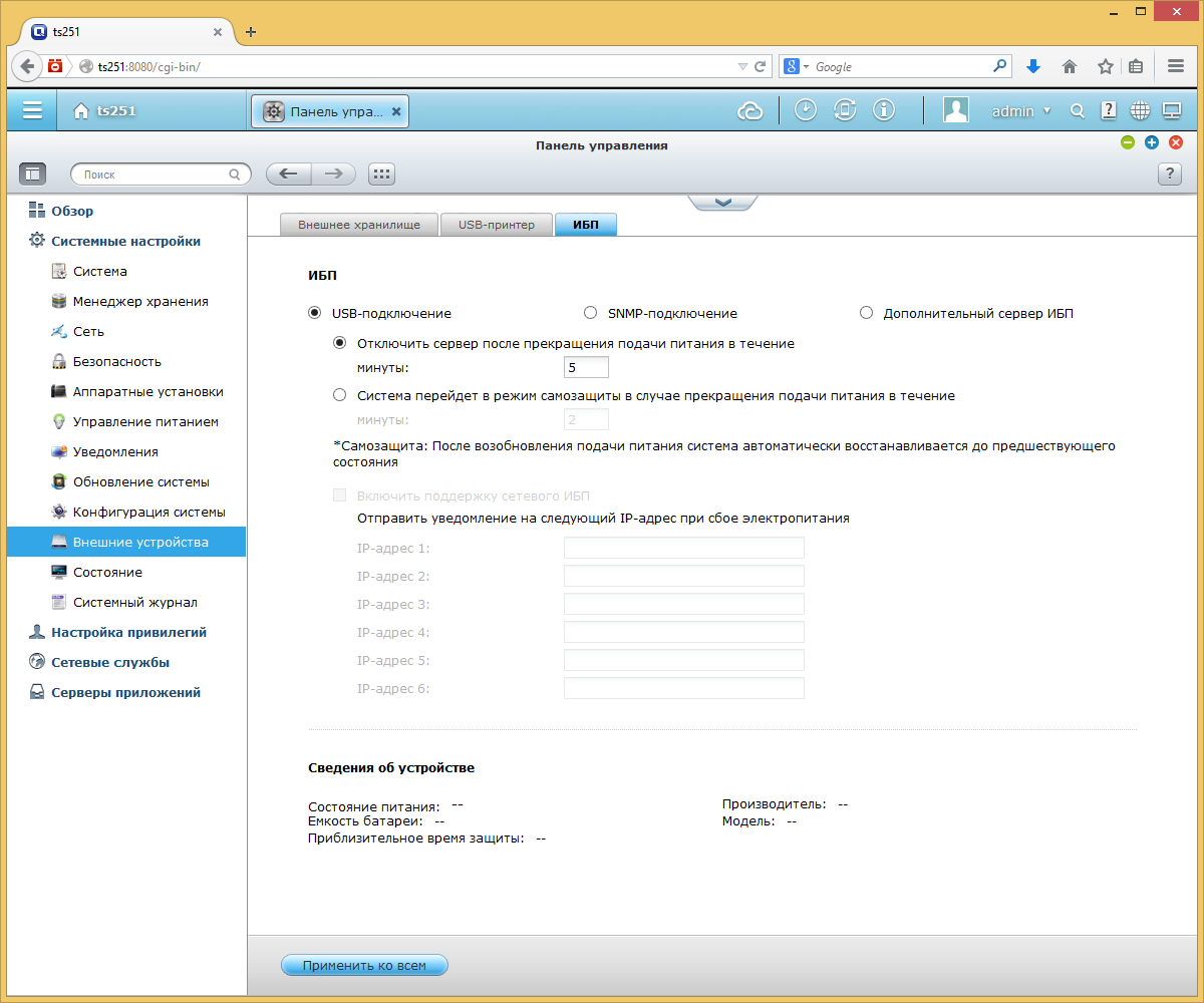 Источники бесперебойного питания позволяют безопасно выключить накопитель в случае длительного пропадания напряжения в сети. Допускается использование не только USB, но и сетевых устройств. Кроме того, можно реализовать обслуживание одним ИБП сразу нескольких накопителей — один из них будет выступать в роли сервера, а остальные — подключаться к нему по сети.