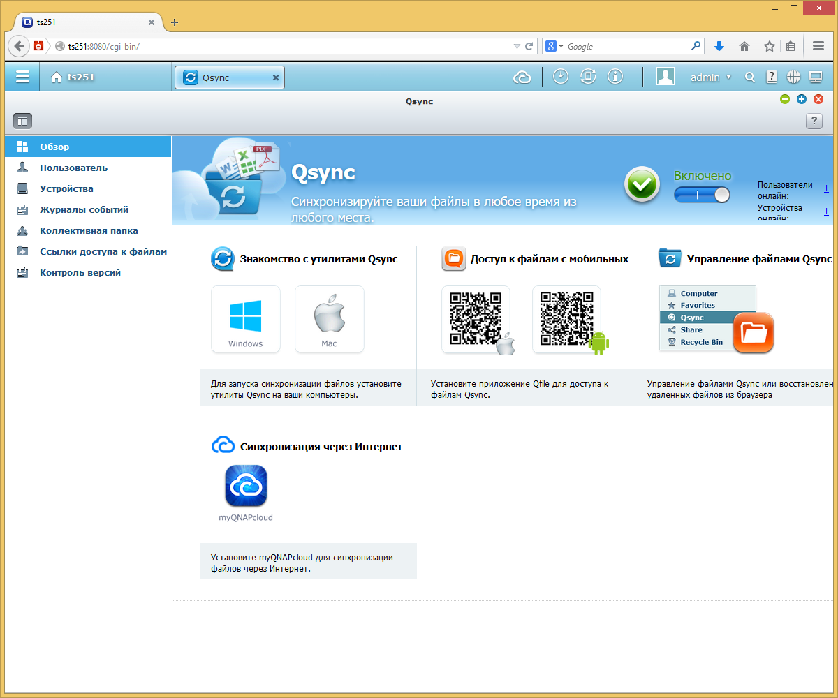 Еще одним сервисом, связанным с синхронизацией документов, является Qsync. Эта служба позволяет пользователю использовать на всех своих компьютерах (с Windows и Mac OS) автоматически синхронизируемую общую папку. Для доступа к данным (но не синхронизации) с мобильных устройств на базе Android и iOS предлагается использовать утилиту Qfile. Текущая версия сервиса имеет определенные особенности, которые существенно влияют на удобство использования. В частности синхронизировать можно только одну папку на ПК и специальную индивидуальную для пользователя папку на сетевом накопителе. При этом работать с ней можно только через File Station. По протоколам SMB, FTP, AFP она недоступна. Из положительных опций отметим контроль версий файлов с возможностью восстановления требуемой копии, а также опцию по предоставлению подпапки для доступа других пользователей.