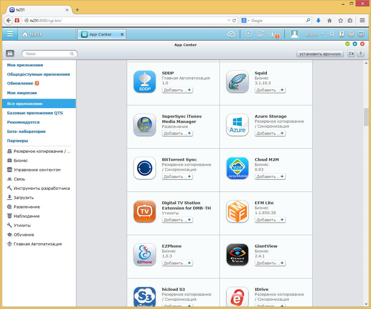 Модульная структура прошивки позволяет легко добавлять новые программные пакеты без переустановки системы. Управлять этим процессом можно через пункт меню App Center. В базовой прошивке установлены четыре наиболее популярных по мнению производителя модуля: Download Station, Music Station, Photo Station, Video Station. Но при необходимости их можно и удалить. Общий список дополнительных программ для рассматриваемой модели в официальном каталоге на момент написания статьи насчитывал более 130 наименований. Они отсортированы как по источнику (разработчику), так и по категории. Описывать все программы, многие из которых общеизвестны, в данном материале нет смысла. Так что упомянем только рекомендованные производителем утилиты, расположенные в разделе «Базовые приложения QTS». Здесь можно найти: CloudLink, DJ Station, Download Station, Music Station, Notes Station, Photo Station, Virtualization Station, Signage Station, Surveillance Station, Digital TV Station, Video Station. Большинство из них уже известны нашим читателям. Напомним только, что система видеонаблюдения имеет в комплекте лицензию на две IP-камеры, а если нужно большее число — потребуется докупить лицензий. Упомянем и модуль QUSBCam, позволяющий использовать для видеонаблюдения USB-камеру, подключенную к сетевому накопителю.