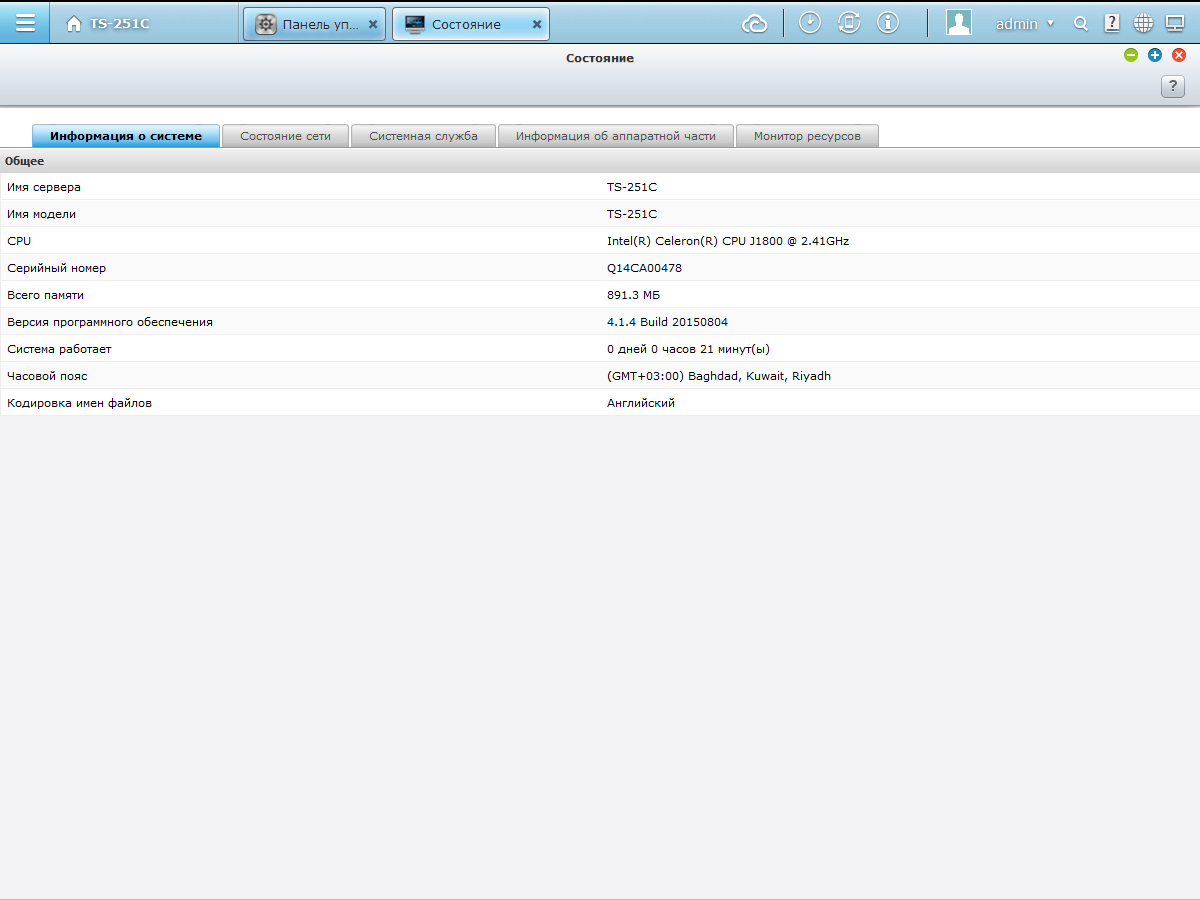 На отдельной странице можно проверить текущий статус сетевого накопителя, включая использование ресурсов, активностью служб, информацию об аппаратной части.