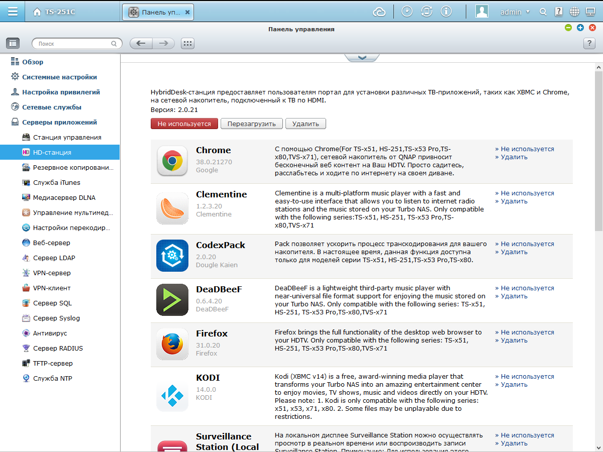 В определенном смысле, использование устройства с локальным подключением к телевизору является некоторым противоречием с концепцией сетевого накопителя. С другой стороны, этот вариант позволяет существенно расширить число решаемых моделью задач. Со времени последнего тестирования, число приложений, способных использовать видеовыход HDMI немного увеличилось. Напомним, что все они собраны в специальном модуле «HD-станция», который нужно установить первым. В некоторых случаях имеет смысл подключение по HDMI к ресиверу для вывода не видео, а звука.