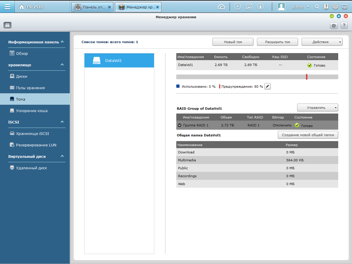 Наличие двух отсеков для винчестеров позволяет использовать различные варианты их конфигурации, включая два независимых тома, а также массивы JBOD, RAID0 и RAID1. В текущей версии прошивки также реализована работа с томами iSCSI. Поддержка пулов хранения и кэша на SSD в данном случае, пожалуй, избыточна.