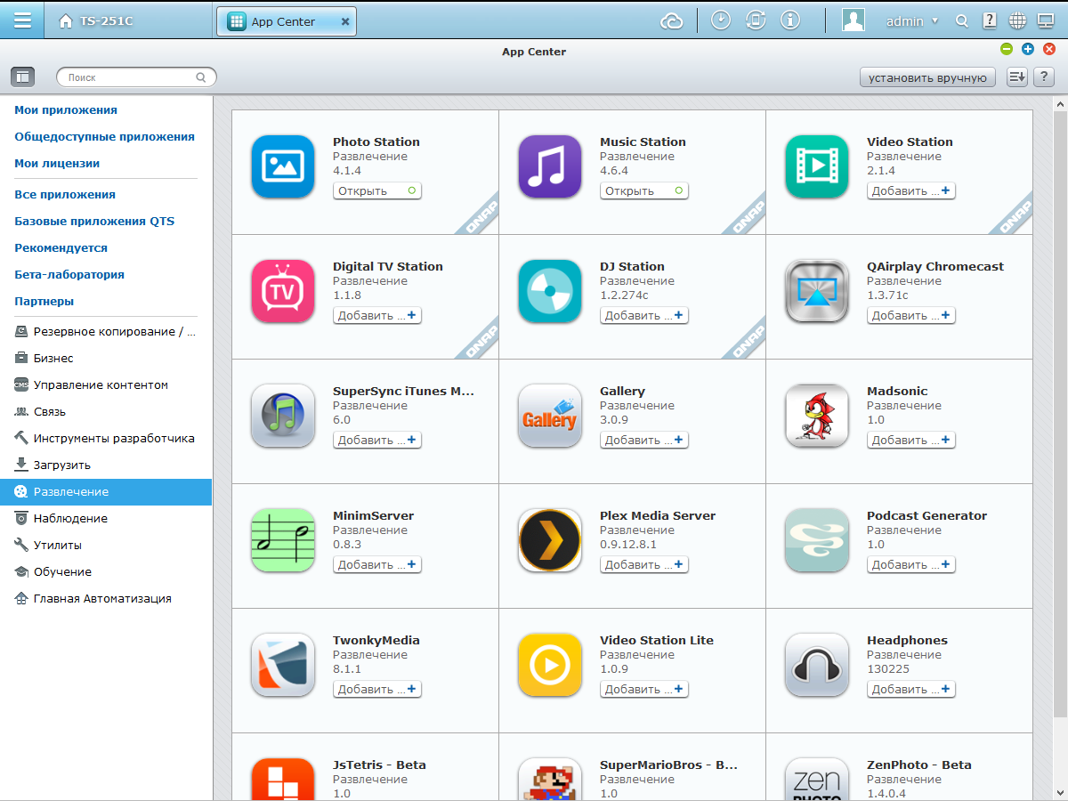 Несмотря на то, что возможности базовой прошивки выходят далеко за рамки сетевого хранения файлов, вы можете еще больше увеличить число решаемых устройством задач благодаря установке дополнительных программных модулей из встроенного каталога или скачанных из сети пакетов. На момент написания статьи, для модели TS-251C официально предлагалось почти 150 программ. Ознакомиться с ними можно на специальной странице сайта производителя. В нем можно найти программы для резервного копирования с поддержкой облачных сервисов, системы управления контентом, модули обмена файлами, языки программирования, медиасервисы, различные утилиты и многое другое. Наиболее интересными являются фирменные модули мультимедийных сервисов Photo Station, Music Station и Video Station, система автономной загрузки файлов Download Station и программа видеонаблюдения Surveillance Station.