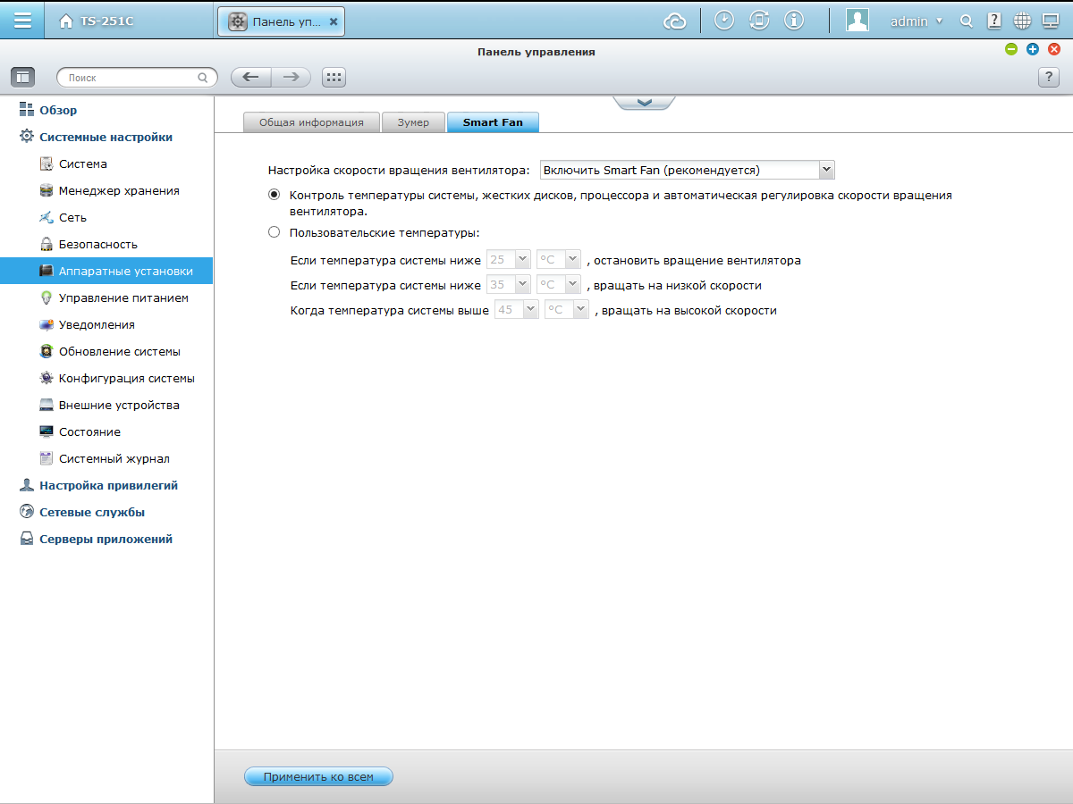 Но более важна в данном случае связь потребления с температурой. Напомним, что в сетевом накопителе используется активная система охлаждения с вентилятором 60 мм. Скорость вращения последнего может выбираться автоматически исходя из показаний температурных датчиков. Предусмотрен как автоматический режим Smart Fan, который мы использовали, так и самостоятельная настройка температурных границ и скоростей (полная остановка вентилятора, низкая и высокая скорости). В частности при работе с дисками WD Red она составляла около 1100 об/мин во всех режимах. А с HGST Deskstar NAS вентилятор раскручивался до 1300 об/мин в режиме бездействия и до 1700 об/мин в сценарии «работа» (в режиме сна его скорость составляла все те же 1100 об/мин). Заметим, что даже на высокой скорости шум от системы охлаждения был невысоким и допустимым для размещения на рабочем столе в офисе.