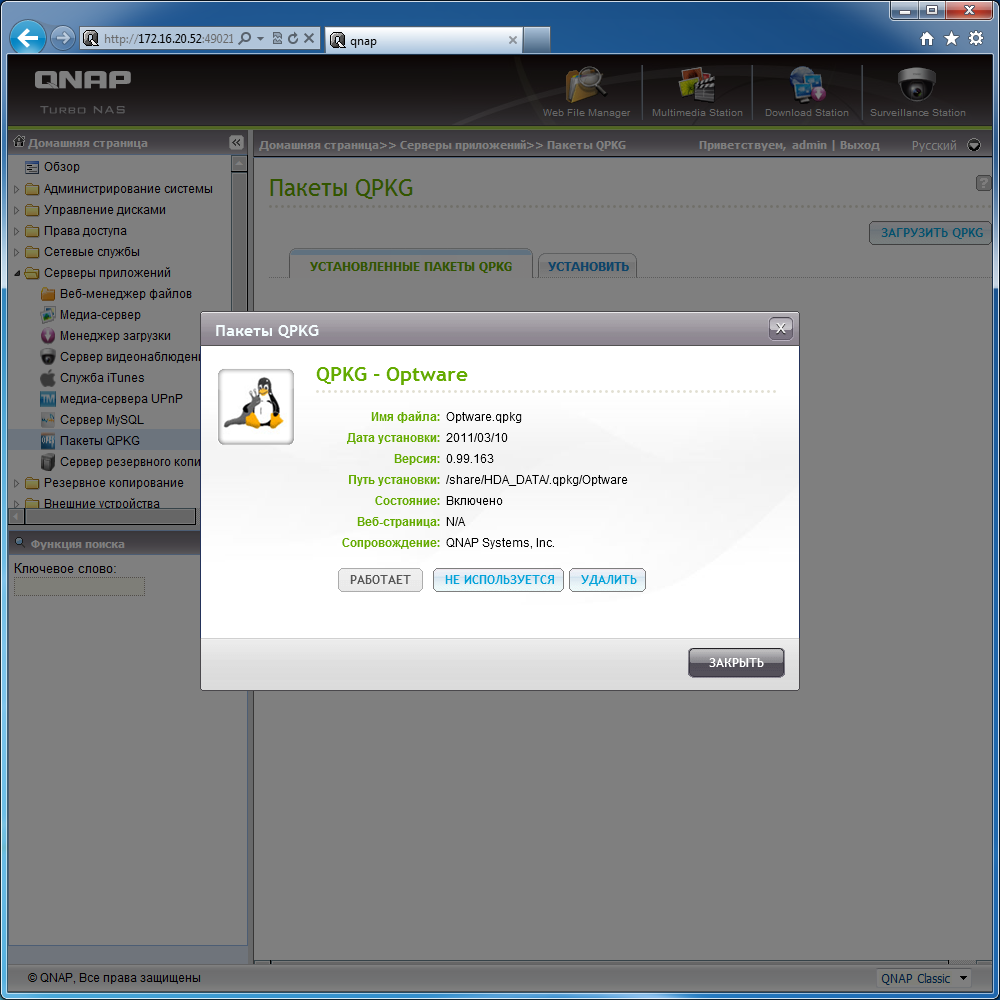 Стандартной и относительно простой опцией по добавлению новых функций является поддержка специальных модулей QPKG, установка который не вызовет проблем у большинства пользователей — нужно скачать пакет с сайта и загрузить его через стандартный веб-интерфейс. Кроме готовых пакетов от производителя, есть и большое количество утилит, разработанных самими пользователями.