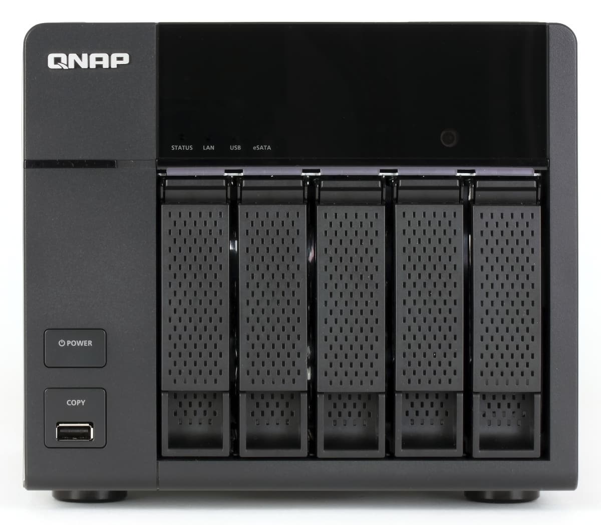 Дизайн корпуса QNAP давно не меняла, так что устройство вполне узнаваемо. TS-569L имеет корпус с размерами 21×23,5×18,5 сантиметров. Передняя панель изготовлена из темного матового пластика и имеет глянцевую вставку в верхней части.