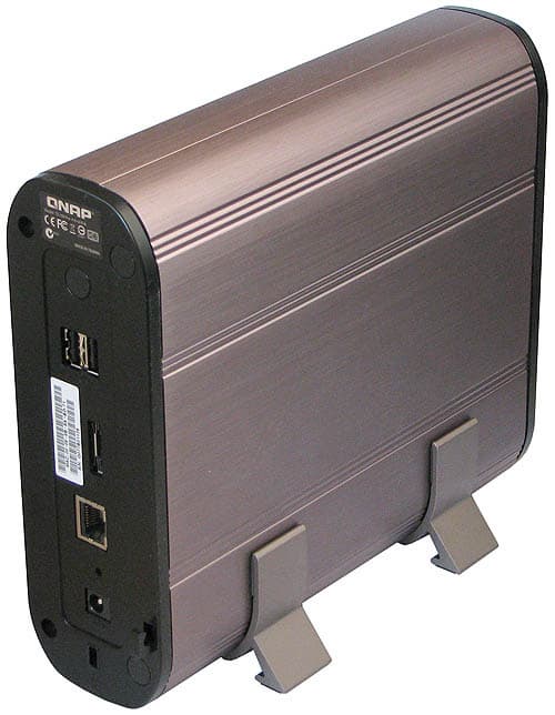 TS-109 Pro весьма красивый — округлые формы, темные пластмассовые торцы и тёмно-серебристый корпус добротного (не тонкого) алюминия. На переднем торце имеются ожидаемые индикаторы: POWER, LAN, eSATA, HDD, STATUS, кнопка питания и разъём USB с кнопкой COPY над ним. Во включённом состоянии индикаторы оказались разноцветными (красный, синий, зелёный, оранжевый) и очень приятных тонов. На заднем имеем: разъём eSATA, кнопку RESET, еще два разъёма USB, RJ45, разъём питания и отверстие под противоугонный тросик.