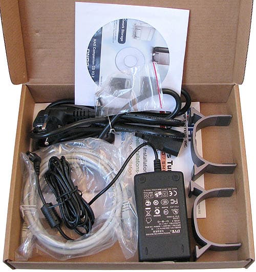 Внутри находим само устройство, две подставки под него, так как работать ему положено только стоя, руководство по быстрой установке (четыре языка: английский, немецкий, французский, испанский), диск с ПО, двухметровый патч-корд, фурнитуру и адаптер питания.