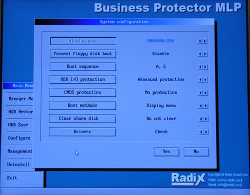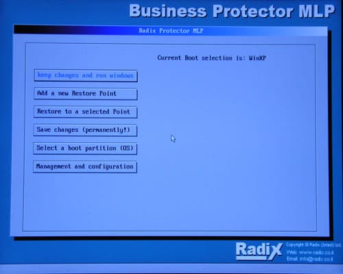 В основном, принципы те же: резервирование важной информации вне защищаемого раздела (или разделов), слежение за файловыми и дисковыми операциями с разделами при работе, возможность быстрого «отката» к работоспособной конфигурации при помощи заранее сохраненной информации еще до загрузки операционной системы. Однако отличия начинаются уже здесь: «ЛанСил» является программно-аппаратным комплексом, где немалая часть работы возложена на собственно программное обеспечение, Radix Protector работает на несколько более низком уровне. Такой подход имеет как свои плюсы, так и минусы. К плюсам относится более высокая степень защиты — на компьютере не может быть незащищенной копии операционной системы, потенциально опасной для работы (в случае карты восстановления данных таковой является любая копия ОС, для которой не установлены драйверы, в случае же Radix данная ситуация просто невозможна). К минусам — меньшая гибкость. В частности, Radix Protector несовместим с операционными системами, отличными от Windows (я не проверил функционирование с модификацией Windows XP для процессоров с поддержкой AMD64/EM64T, поскольку пока это бета-версии, которые вряд ли кто-то будет использовать на компьютерах, нуждающихся в высокой безопасности работы, однако, судя по косвенным признакам, пока и проверять-то нечего — ситуация с данной версией не лучше, чем с Linux; может и хуже, поскольку для последнего хотя бы специальная версия системы существует), да и с обычными бут-менеджерами тоже (возможность использовать несколько ОС, тем не менее, сохраняется, однако требует дополнительных телодвижений и не столь прозрачна). Кроме того, данный подход делает практически невозможной конфигурирование устройства при помощи программ высокого уровня, заставляя использовать встроенный Setup, с куда более слабыми интерфейсными возможностями. Впрочем, назвать это существенным недостатком нельзя — грамотному сисадмину неудобств сие не доставит. Хуже то, что выбранный метод работы существенно затрудняет централизованное управление средствами восстановления при помощи локальной сети — для карты «ЛанСил» существует простая и относительно недорогая программа LanCtrl (расширяющая возможности стандартной WinCtrl в плане сетевой работы), Radix тоже может предложить средство для работы в локальной сети, однако более сложное и дорогое, поскольку и аппаратура специальная используется.