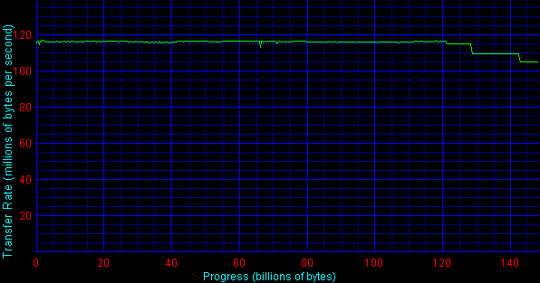 Ах вот оно что! Просто-напросто контроллер Iwill IS150 предназначен для классической PCI 32bit/33MHz, дающей максимальную (читай, недостижимую в реальных условиях) пропускную способность (32bit/8)*33MHz = 133 MB/sec. Таким образом, практически на всем протяжении графика скорости линейного чтения (точнее, на первых 120 из 148 GB массива) эта самая скорость чтения ограничивается пропускной способностью шины. Кстати, то же самое, но в меньших масштабах — на первых 20GB, можно наблюдать и для RAID0-массива двух WD360GD. Это объясняет, почему на верхнем графике «Disk Transfer Rate» скорость чтения в конце массива в два раза превосходит скорость чтения в конце отдельного диска, а для значений скоростей, полученных на начале диска/массива, это правило не работает.