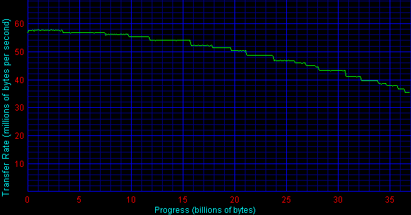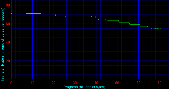 Диск продолжает выдавать блестящие результаты. Помимо уже продемонстрированного общего первого места по скорости линейного чтения, новинка показывает замечательную «стайерскую выносливость» — первая ощутимая ступенька падения скорости линейного чтения приходится на 21-23GB, вторая — на 39-40GB (это больше половины диска), до 39GB скорость падает лишь на 3MB/sec, что является редким и приятным результатом. (Насколько я помню, из последних дисков только SCSI-пятнадцатитысячник Fujitsu MAS53367NC c вчетверо меньшим размером мог похвастаться подобной стабильностью линейного чтения до половины своего размера).