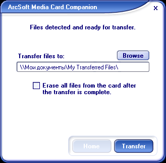 Все хорошо видно на рисунке. Нажимаем кнопку — всплывает окошко, позволяющее выбрать каталог назначения и указать, нужно ли стирать файлы с карты. Полезность данной утилиты лично для меня сомнительна: кому нужно «попроще», может воспользоваться просто стандартными средствами Windows XP (благо последняя предлагает при установке карты в накопитель копировать с нее файлы изображений; очищать карту только не умеет), «продвинутые» же пользователи, скорее всего, предпочтут файловый менеджер и полный контроль над операцией. Но хуже от этой опции точно не будет, так что ни ругать, ни хвалить SanDisk за дополнительную кнопку как-то не выходит.