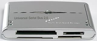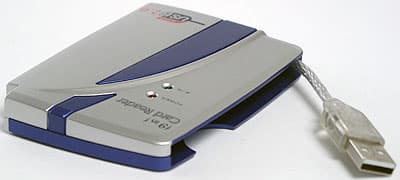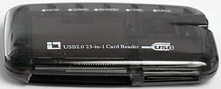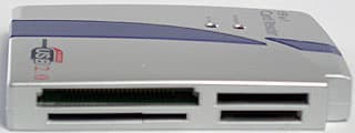 Типичный представитель класса безымянных устройств, снабженный совершенно стандартным вот уже несколько лет как набором из четырех слотов, USB-коннектором и двумя светодиодными индикаторами (питания и активности). При этом стоит отметить, что в прошлый раз мы (вернее, производители) остановились максимум на 18 номинально-поддерживаемых типах карт, но за полгода ставки явно выросли ;) А ведь это все те же четыре слота, что два года назад позволяли называть устройство лишь «7 in 1» максимум! Кроме того, проверка показала, что в случае карт уменьшенного размера, но физически совместимых с крупными «прародителями» не все гладко — в частности, RS-MMC придется использовать исключительно с переходником. С MS Duo, к счастью, проблем никаких.