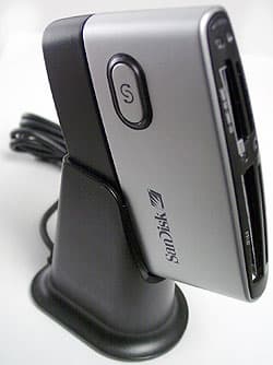 Как и ранее, требуется использовать только кабель из комплекта поставки — разъем стандартный (mini-B), однако немного заглублен в корпус, поэтому «обычные» кабели (коими завалены все рынки) подойдут разве что после доработки острым ножом. Зато, как и прежде, картовод можно не только положить на стол, но и установить на специальную подставку. Но есть в новой линейке стационарных картоводов SanDisk (и одностандартных тоже) еще одно отличие от предыдущих моделей — кнопка на корпусе. Предназначена она для копирования содержимого карты на компьютер и работает только после установки специальной утилиты.