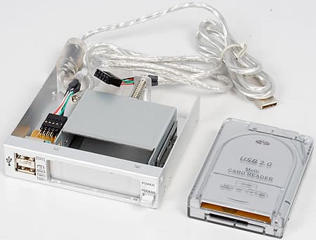 Сам картовод невелик, так что легко поместится, например, в карман рубашки. Снабжен двумя слотами, чего все равно достаточно (благодаря их конструкции) для поддержки всех современных типов флэш-карт. Кое-чем, конечно, придется жертвовать — в данном случае прямой совместимостью с картами уменьшенных размеров: их придется использовать совместно с переходниками, но тут ничего не поделаешь. Сзади расположен поворотный USB-разъем, что при подключении к компьютеру позволяет обойтись без кабелей. А рядом с ним еще один разъем USB, но уже B-типа. Зачем он нужен? Через него осуществляется контакт с доком, устанавливаемым в свободный отсек для 3,5-дюймовых накопителей. Чудесное решение! При стационарном использовании никаких проводов, никаких коробок на столе — полноценное внутреннее устройство. Нужно его взять с собой? Нажимаем кнопку и получаем достаточно компактный мультиформатник, который можно подключить к любому компьютеру.