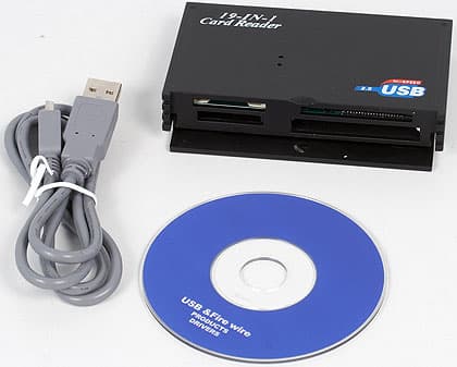 Открывает наш парад классика продукции «скромных» производителей, не рвущихся к известности. Единственной интересной особенностью данного устройства можно считать крышку, которая, по замыслу конструкторов, при транспортировке устройства должна закрывать слоты от попадания мусора (подобная была у Lexar Multi-Card Reader). В остальном ничего нового — давно привычная прямоугольная коробочка с четырьмя слотами для всех основных типов карт памяти, за исключением их компактных модификаций, да USB-разъем типа mini-B на противоположной грани.