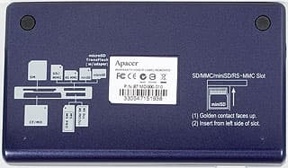 Согласно утверждениям Apacer, данный картовод поддерживает 23 типа карт. Как получаются все эти дикие количества, я в свое время писал. Как видим, даже крупные фирмы гонка за попугаями не миновала. Да и не могла она их миновать — можно честно написать нечто типа «12 in 1», но попробуйте потом продать это, если рядом лежит внешне неотличимое, но вдвое более дешевое устройство, на котором написано «40 in 1». Поэтому гонка виртуальных вооружений будет продолжаться и дальше. И использоваться в ней будут все средства.