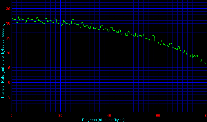 Как видно, все три диска Samsung примерно одинаковы по этим параметрам — «восьмидесятка» слегка медленнее остальных, видимо, за счет «адаптивной» разметки. Впрочем, с другими экземплярами дисков все может оказаться по-другому. Впрочем, «эластичная плотность записи» на спасает самсунги от заметного проигрыша аналогичным дискам других компаний с 40-гигабайтными пластинами — 5-7% по средней и более 10% по максимальной скорости чтения.
