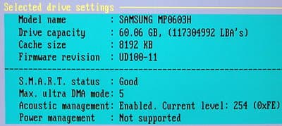 По среднему времени доступа все три модели Samsung также примерно одинаковы, хотя старшие все же слегка медленнее — головок-то побольше. Как я уже отмечал в обзоре модели MP0402H, накопители этой серии поддерживают управление акустиков через регистр Acoustics Management.