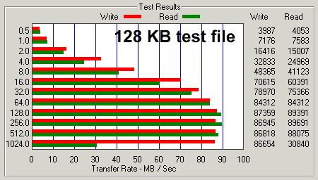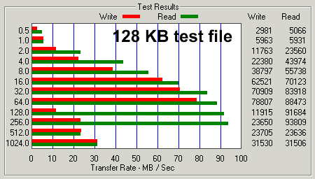 Другим показательным тестом «внутреннего устройства» дисков является тест на скорость чтения и записи файлов различного объема блоками разного размера — от 512 байт до 1 Мбайт. Для этого я традиционно использую тест ATTO Disk Benchmark. На скриншотах ниже показаны результаты для четырех размеров тестового файла — 128 Кбайт, 1 Мбайт, 4 Мбайт и 32 Мбайт. Если первый и второй, как правило, гарантированно кэшируются буфером диска (причем, кэширование записи и чтения для мегабайтного файла не так однозначно), то последний просто в него «не влезает», а кэширование предпоследнего зависит не только от объема буфера, но и от специфики работы firmware накопителя (кстати, результаты данного теста практически не зависят от выбора между FAT и NTFS).