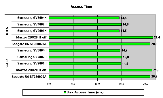 По времени доступа диски от Samsung — явный лидер. Среди всех дисков, побывавших у нас на тестировании, по этому показателю они уступают только… Samsung SV20400. Очень и очень неплохо для дисков с такой плотностью записи!