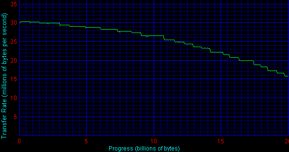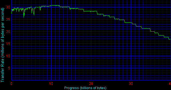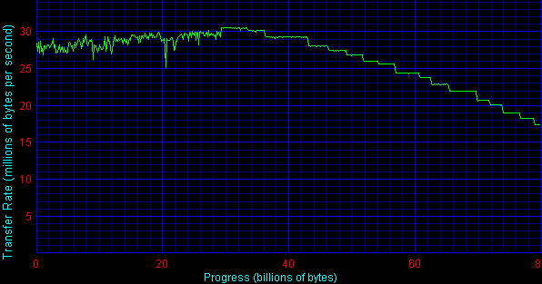 Как видно на графиках, максимальная скорость чтения у всех дисков практически одинаковая — те самые 30 с небольшим тысяч байт в секунду, вот только достигается она не всегда в начале диска. Интересный эффект. Ни у Maxtor 541DX, ни у Seagate U6 такого не наблюдается. Также обращает на себя внимание рост скорости чтения в конце диска при росте объема. В чем тут причина — не могу сказать. В общем и целом — Maxtor остался недосягаем, а с Seagate U6 примерный паритет.
