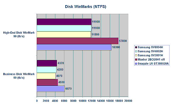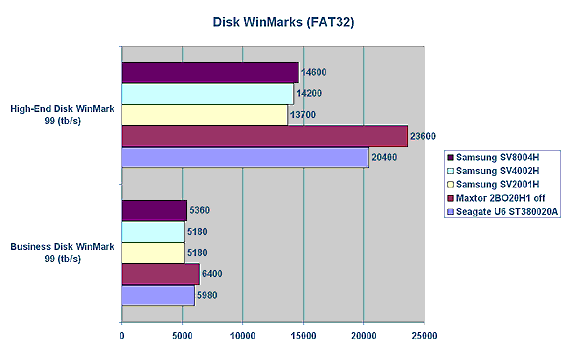 Ставший уже стандартным провал дисков Samsung в тестах, основанных на реальных приложениях, ставит в тупик. Похоже, разработчики компании принципиально не обращают внимание на Ziff-Davis Disk WinMarks. Но это на данный момент лучшие дисковые тесты, основанные на реальных приложениях, и не принимать их во внимание нельзя. Рост результатов в тесте High-End Disk WinMark при использовании файловой системы FAT32 объясняется, по-видимому, увеличением размера кластера.