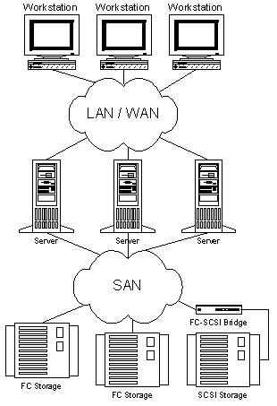 Используя традиционный SCSI интерфейс, пользователь при построении систем резервирования и восстановления данных сталкивается с рядом сложных проблем, которые можно очень просто решить, используя технологии SAN и FC.