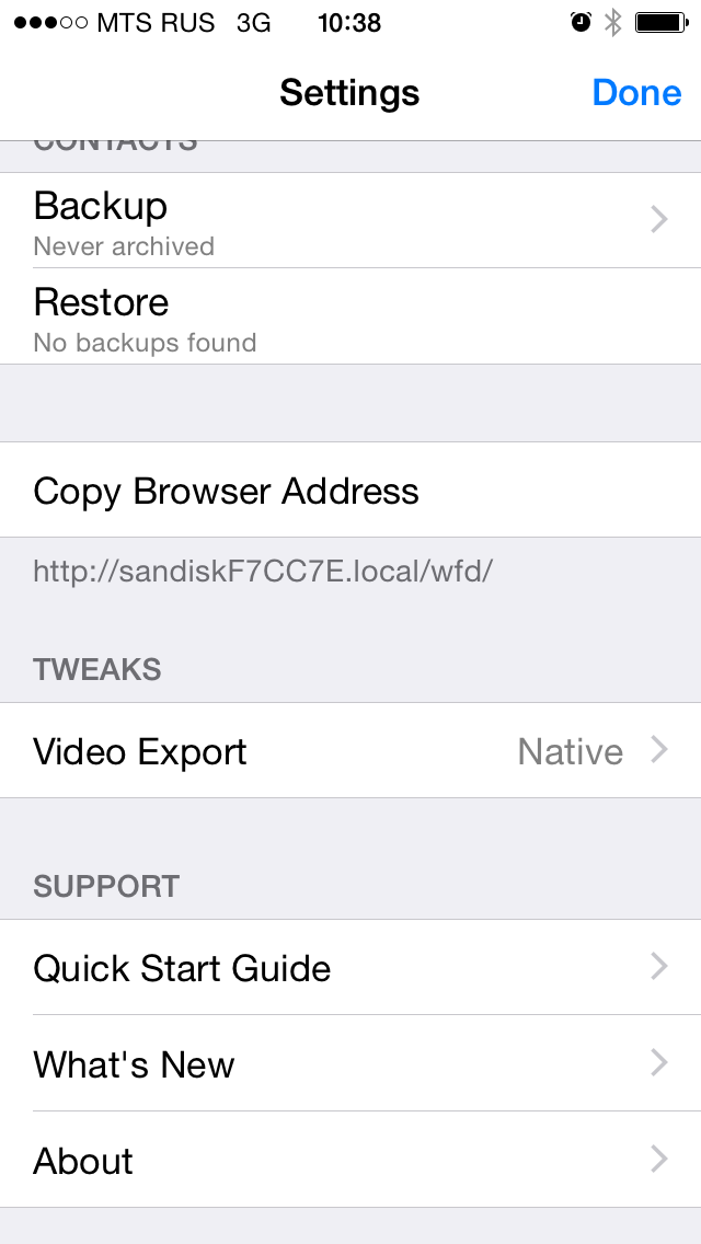 Для видео в версии для iOS есть интересная опция по транскодированию — можно выгружать на накопитель как оригинальные версии видео, так и преобразовывать их средствами смартфона в более простой формат. В частности для записей с iPhone 5S, которые в оригинале имеют параметры 1080p 13 Мбит/с, получается 720p 900 Кбит/с. Это может быть интересно для последующего воспроизведения видео с беспроводного накопителя, поскольку, как мы увидим в дальнейшем, он имеет невысокую скорость передачи. Хотя конечно падение качества при таком преобразовании очень существенное. Возможно, здесь стоило использовать более высокий битрейт.
