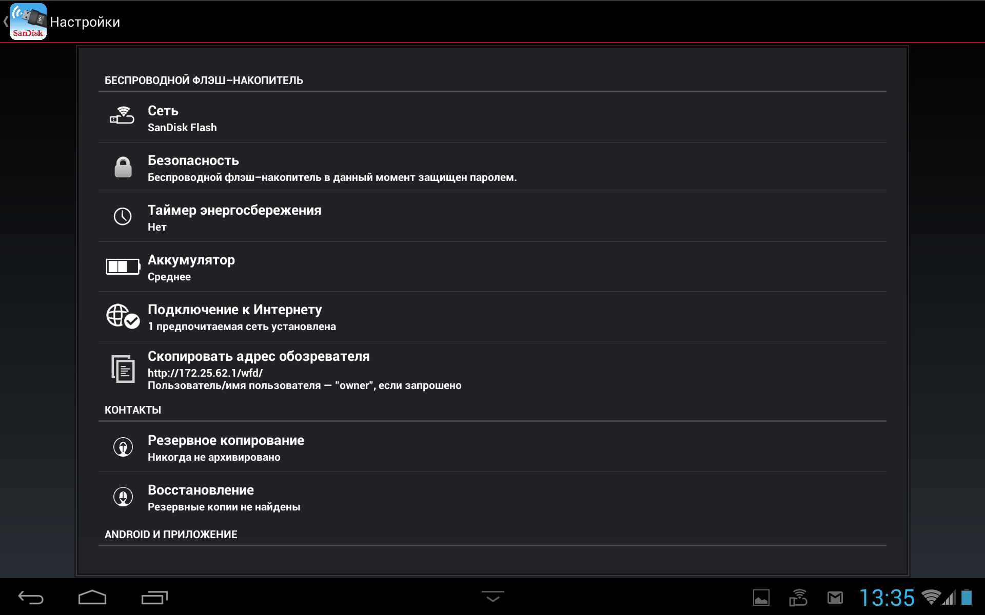 Кроме упомянутых выше настроек, в мобильной утилите можно осуществить и подключение сетевого накопителя к существующей беспроводной сети (отметим, что через браузер с компьютера эта настройка недоступна). Маршрутизатором устройство в этом случае не работает и, несмотря на работу и собственной беспроводной сети, через нее подключиться к сети основного роутера не получится. Также стоит отметить возможность работы в Интернет через сотовое соединение с одновременным подключением по Wi-Fi к накопителю. Из дополнительных функций программы упомянем резервное копирование и восстановление записной книжки смартфона.