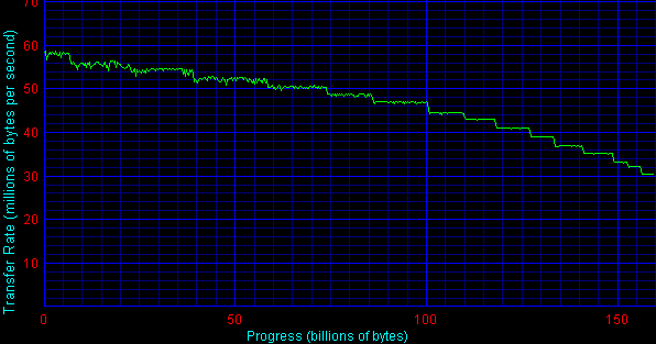 Скорость линейного чтения у новой Барракуды по сравнению с 80-гигабайтной практически не изменилась. По этому параметру Barracuda 7200.7 отстает от дисков других производителей с плотностью записи 80 GB на пластину и чуть превосходит лишь WD2000BB с плотностью записи порядка 67 GB на пластину.