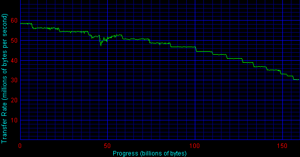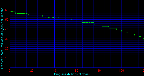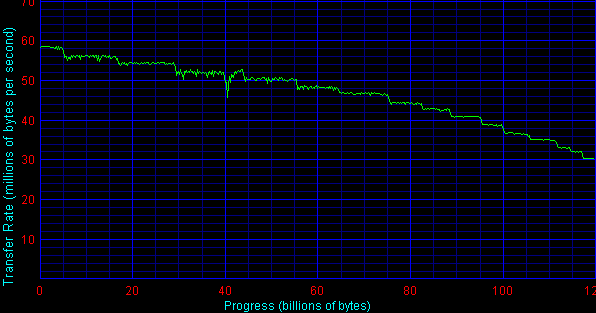 А вот графики у дисков с интерфейсом SATA не такие гладкие. Причем любопытен провал в районе 40-гигабайтной отметки. Интересен он тем, что встречается у всех дисков независимо от емкости