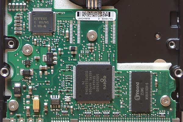 Слева — электроника диска ST3160023AS с последовательным интерфейсом, справа — ST3160023A с параллельным интерфейсом и буфером объемом 8 МB. Разница видна даже невооруженным глазом.