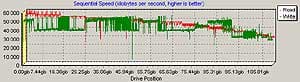 Средняя скорость чтения, тоже практически не изменилась, а вот со скоростью записи произошли чудеса. Диск пишет, по данным теста, практически с той же средней скоростью, что и читает! График тоже, прямо скажем, оригинальный.