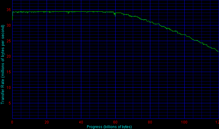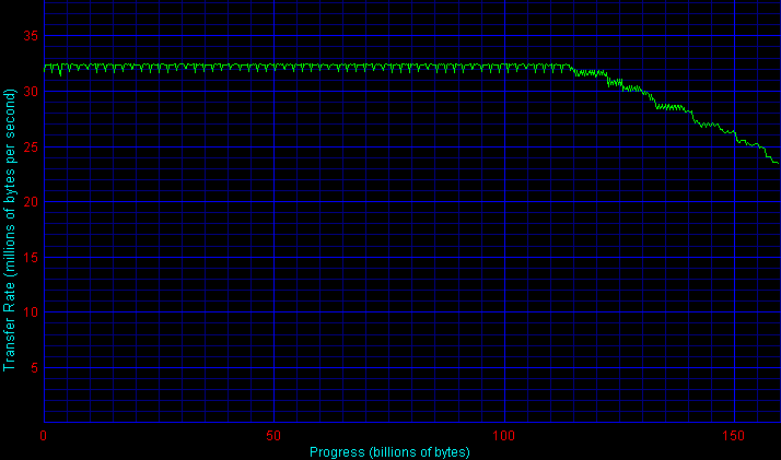 Скорость работы интерфейса Hi-Speed USB у нашего героя достаточно высокая, хотя и не рекордная. По данным теста HD Tach 3.0.1.0 скорость интерфейса нашего героя составляет около 33 Мбайт/с, а по результатам теста скорости линейного чтения (Transfer Rate) WinBench 99 она составляет около 32,5 млн. байт/с (см. график далее).