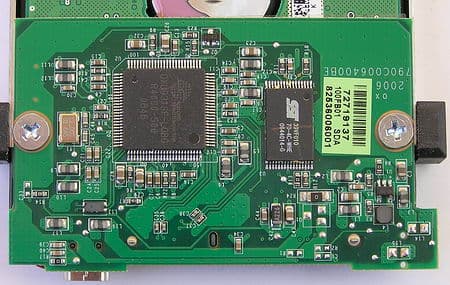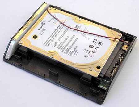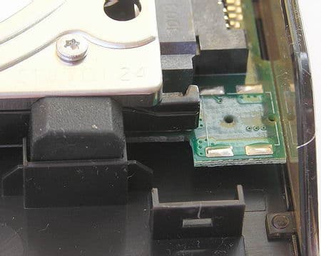 Внутри мы видим отмеченный выше распределитель света, жесткий диск Seagate Momentus 5400.3 ST9160821AS объемом 160 Гбайт с (внимание!) интерфейсом Serial ATA и небольшую платку преобразователя интерфейсов. Винчестер покоится на основании корпуса на 4 резиновых втулках-амортизаторах. При этом он не зафиксирован в корпусе (хотя втулки сидят в пазах основания достаточно плотно), а верхняя крышка корпуса не касается верхней крышки винчестера (зазор около миллиметра). Плата контроллера разъемом SATA плотно вставлена в разъем жесткого диска и привинчена к нему снизу.