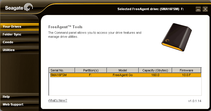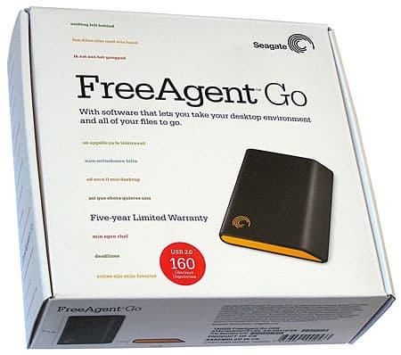 В линейке портативных USB-накопителей Seagate FreeAgent Go на базе 2,5-дюймовых жестких дисков сейчас значатся три модели емкостью 80, 120 и 160 Гбайт. Кроме емкости, они одинаковы во всем: при габаритах 122×99×18,5 мм и весе 182 г (с диском) эти накопители имеют интерфейс USB 2.0, оснащены жестким диском со скоростью вращения пластин 5400 об./мин. (точнее — Seagate Momentus 5400.3 с перпендикулярной магнитной записью) и комплектом фирменного программного обеспечения, поддерживающего, в том числе, шифрование содержимого дисков по 256-битному AES. Накопители совместимы с операционными системами Windows Vista/XP/2000 и MacOS 10.3.9 и выше. Исходно накопители отформатированы одним разделом на полную емкость с файловой системой NTFS, из которых около 120 Мбайт занимает комплектное ПО. Вообще, базовые спецификации предельно скупы даже по сравнению с WD Passport. Зато на накопитель Seagate дается пятилетняя гарантия производителя.
