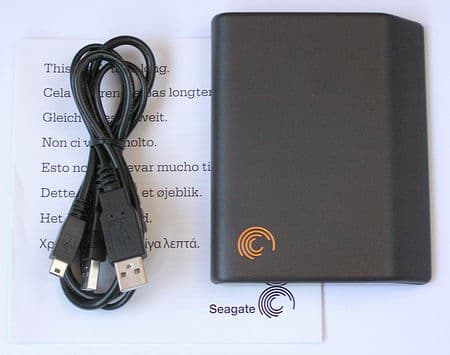 Комплект поставки Seagate FreeAgent Go достаточно аскетичен. В картонной коробке с многоязычными надписями и маркировкой, уложенные в антиударную картонную форму-амортизатор, находятся только сам накопитель и кратеньким бумажным руководством по установке и USB-шнур к нему (длиной 75 см) с ответвлением для дополнительного питания от второго разъема USB. Впрочем, и питания от единственного порта USB данному дивайсу вполне хватало (судя по моему опыту). Причем подходит любой стандартный USB-кабель с разъемом mini-USB на одном из концов — в отличие прежнего портативного накопителя Seagate, которому требовался уникальный USB-кабель.