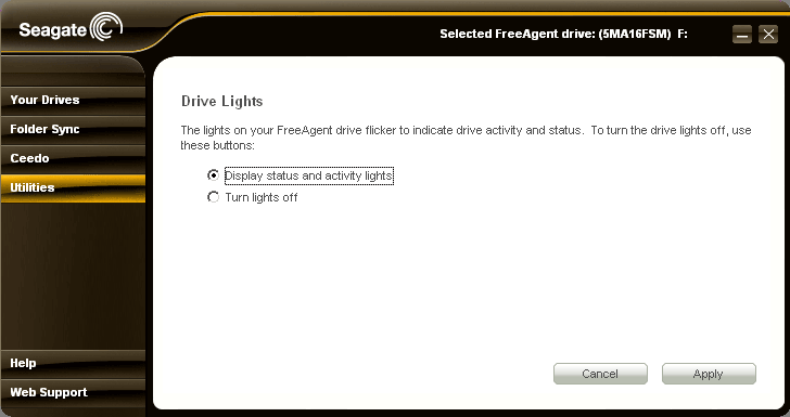 Решение оригинальное и выглядит очень стильным в выбранной производителем цветовой гамме. Особенно эффектно это смотрится в полутьме. Причем постоянное яркое свечение соответствует режиму idle (диск включен и готов к работе), а медленное плавное изменение яркости от максимальной до приглушенной — режиму обращения к диску. Недостаток здесь один — тем, кто привык ориентироваться в динамике обращения к накопителю по быстро и в такт отращениям мигающему индикатору, в данном случае придется «туго», поскольку период изменения яркости индикатора FreeAgent не зависит от интенсивности обращений и равен нескольким секундам.