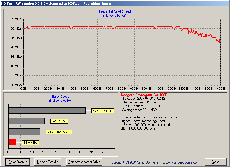 Среднее время доступа у Seagate FreeAgent Go соответствует таковому у применяемого винчестера и является сейчас одним из лучших среди аналогов — здесь вообще лидируют накопители с дисками Seagate (включая Maxtor OneTouch III Mini).