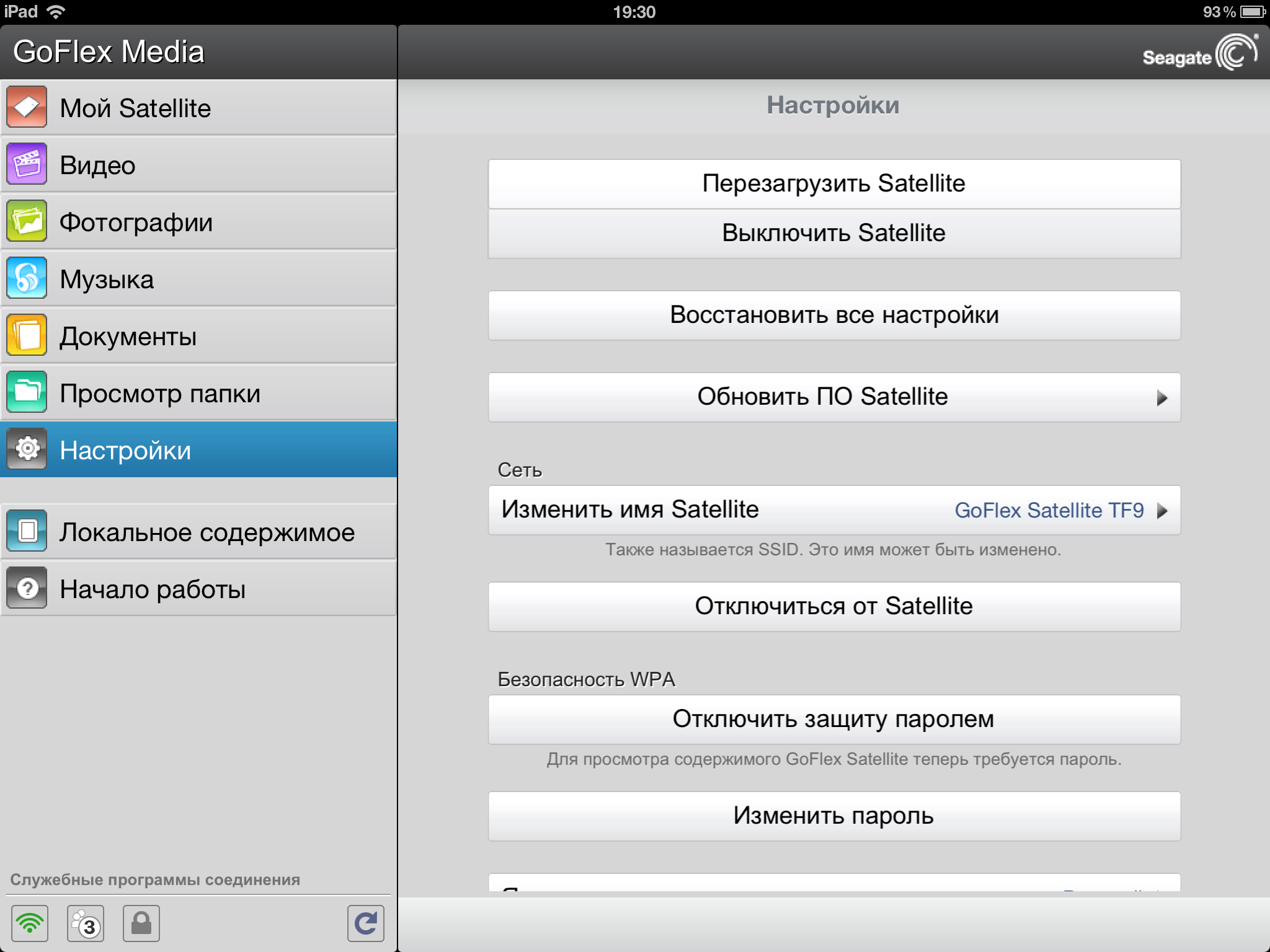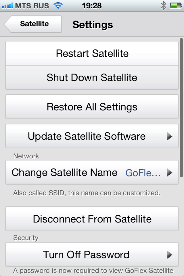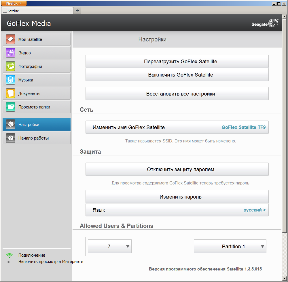 В обновлении прошивки 1.3.5.015 появилась возможность одновременного доступа к накопителю и интернету с мобильных устройств. В этом случае GoFlex Satellite сначала подключается к внешней беспроводной сети как клиент, а потом сам создает и собственную сеть. При этом на него возлагается задача маршрутизации пакетов от клиентов в интернет (доступный во внешней сети). Отметим, что в этом режиме собственные сервисы накопителя доступны и во «внешнем» сегменте. Например, если вы подключились в гостинице к ее Wi-Fi-сети, то другие постояльцы смогут смотреть видео с вашего устройства без ввода каких-либо паролей.