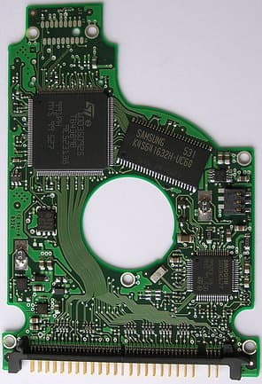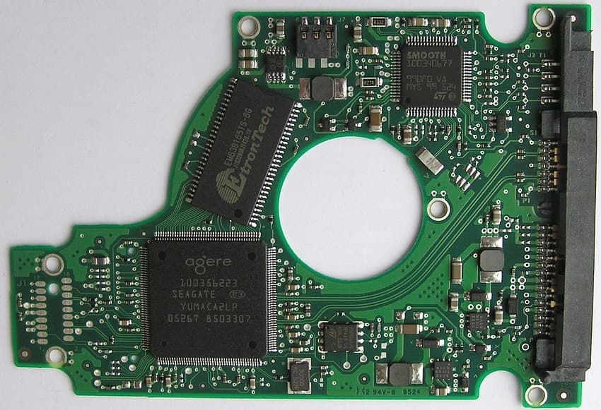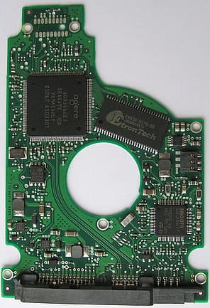 Печатные платы двух моделей с разными интерфейсами сходны по форме и компоновке, хотя и различаются применяемой элементной базой и разводкой. Различие касается, прежде всего, используемого микроконтроллера, хотя помимо этого на плате SATA-диска присутствуют также некоторые другие элементы, отсутствующие на PATA-контроллере. Например, импульсный преобразователь питания и др. Кстати, печатные платы у контроллеров таких дисков очень тонкие — всего 0,6 мм в толщину (с маской), хотя при этом и многослойные — как минимум, три слоя металлизации. А между платой и корпусом есть мягкая изолирующая прокладка. Колодка электроконтактов, к сожалению, игольчатая, хотя для сигналов шпиндельного мотора используются 3 (а не 4, как бывает чаще) прижимные позолоченные лапки.