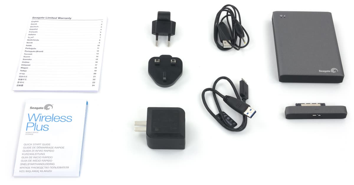 Комплект поставки состоит из винчестера, внешнего блока питания с выходом USB (5 В 2 А) и сменными насадками для разных розеток (Европа, США, Великобритания), специального кабеля питания длинной один метр, блока для подключения винчестера к порту USB 3.0 компьютера, гарантийного талона и краткого руководства пользователя.