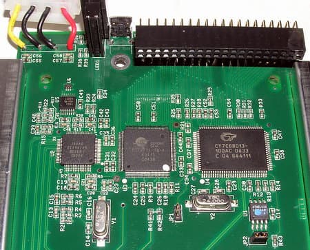 Все компоненты на четырехслойной плате компактно расположены с одной стороны (при монтаже эта часть «смотрит» в сторону платы контроллера самого диска, но отделена от нее внушительной металлической пластиной-экраном). За USB-порт отвечает популярный контроллер CY7C68013, за FireWire — чип Agere FW802B, а IDE-канал обслуживается не менее популярным среди создателей внешних накопителей контроллером OXFW911-TQ-A от Oxford Semiconductor, который служит мостом между шинами IDE и FireWire.