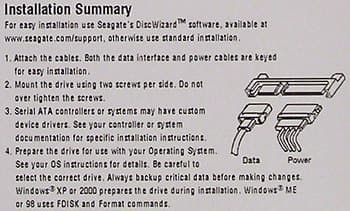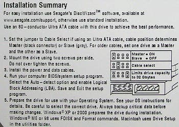 Поставляются данные накопители Seagate в OEM-варианте даже без традиционных ударозащитных пластиковых коробочек — только в анитистатическом пакетике. Чтобы не тратиться на отдельное «бумажное» руководство по установке, необходимые инструкции по установке приведены прямо на корпусе дисков: