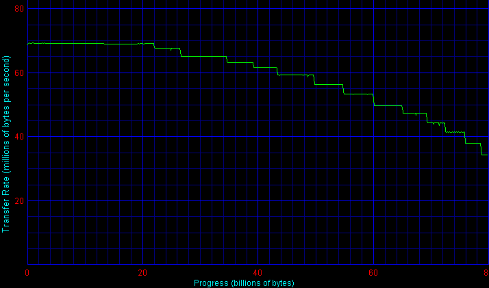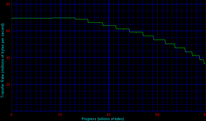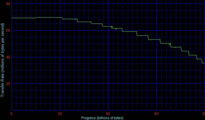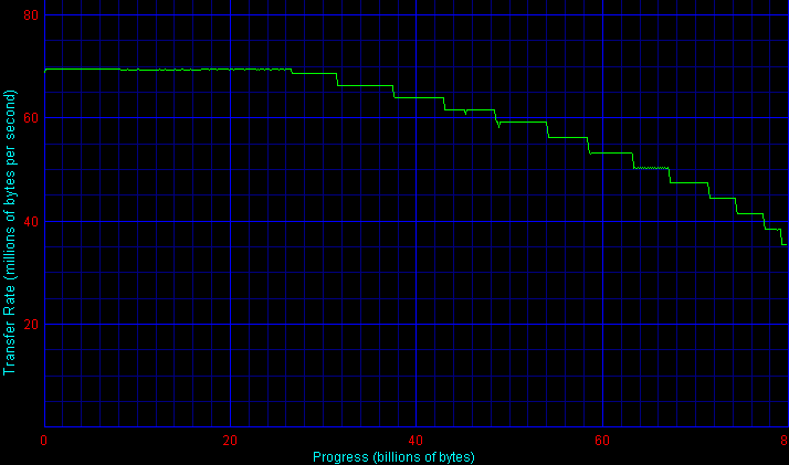 Видно, что графики для четырех взятых наугад SATA-моделей ST3808110AS практически не повторяют друг друга ни по границам зон форматирования (у каждого диска они разные), ни по значениям скорости. Лишь в начале диска, когда скорость на протяжении достаточно большого промежутка близка к постоянной, эти значения близки у разных дисков. Справедливости ради замечу, что по максимальной скорости (в начале диска) значения у этих накопителей модели ST3808110AS достаточно близки к 400-гигабайтным дискам Seagate серии Barracuda 7200.8, которые используют 133-гигабайтные пластины. Правда, там среднее значение скорости (усредненное по всему диску) оказывается заметно меньше, чем у героев этого обзора (56300 против 57000-59000), да и минимальное с максимальным значения здесь все же повыше, чем были у прежних четырехсоток, но факт остается фактом — некоторое сходство определенно есть. Особенно если сравнить эти графики с графиком для UATA-модели ST3802110A, который оказывается существенно выше, чем для SATA-моделей этого же объема серии 7200.9, и ставит новый рекорд скорости линейного чтения для накопителей с интерфейсом ATA — под 80 млн. байт/с, наголову опережая всех конкурентов! Вот они — 160-гигабайтные пластины в действии во всей красе. И мне было очень странно, что SATA-модели Seagate той же емкости не используют этих возможностей, демонстрируя на 12% более низкую максимальную и на 5-6% более низкую среднюю скорость. Как я ни искал, найти модель ST3808110AS с такой же скоростью (хотя бы близко), как у испытанной здесь ST3802110A, не смог. Может быть, кому-то из вас повезет больше — все-таки современное адаптивное форматирование у Seagate способно на многое.