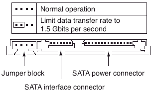 Стоит, правда, отметить, что джампер этот не такой, как у обычных ATA-дисков, где используются pin-контакты с шагом 2,54 мм, а меньшего формата (с двухмиллиметровым шагом) — какой применяется, например, в ноутбучных или некоторых SCSI-дисках (или в некоторых очень старых IDE-моделях). Поэтому сходу перемычку на такой джампер, в случае необходимости, сможет найти далеко не каждый пользователь, а в комплекте поставки перемычки, к сожалению, нет. Да и не факт, что если диск будет испытывать проблемы совместимости с одним из старых SATA-контроллеров (см. ниже), то даунгрейд скорости интерфейса на стороне диска эту несовместимость сможет исправить.