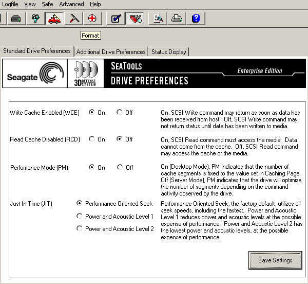 но также осуществлять над SCSI-дисками Seagate некоторые дополнительные «продвинутые» (Advanced) операции: включать и выключать кэширование чтения и записи буфером диска, переключаться между тремя (!) режимами поиска в целях оптимизировать потребление/нагрев и шумность работы накопителей и так далее. Но наиболее интересной для нас в текущем контексте является возможность переключать новейшие SCSI-диски Seagate между двумя разными моделями (политиками) кэширования — Desktop Mode и Server Mode. Этот пункт в меню SeaTools носит название Performance Mode (PM) и может принимать два значения — On (Desktop Mode) и Off (Server Mode).