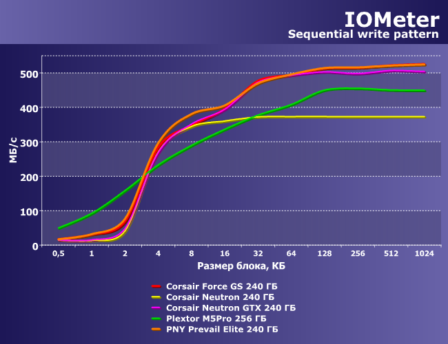 При чтении все накопители переваливают за 500 МБ/с, что и было обещано их производителями. Смущает только то, что PNY Prevail Elite «набирает ход» с ростом размера блока медленнее прочих, хотя мы надеялись на обратное. Что ж — тоже результат: для SF-2281 большого смысла в увеличении количества микросхем выше восьми уже нет. В отличие от того же Marvell (где «старые» модели на 32 нм флэше с легкостью громят новые во многом из-за большего количества чипов) или «классических» десятиканальных Intel. Что неплохо коррелирует и с тем, что на этом контроллере накопители на 480 ГБ не быстрее (а то и медленнее), чем на 240 ГБ, но вот 120 ГБ и менее — традиционно всегда в отстающих (за исключением экзотики типа OCZ Vertex 3 Max IOPS, где применялась как раз 32 нм память, которой нужно было ставить много в плане количества чипов).